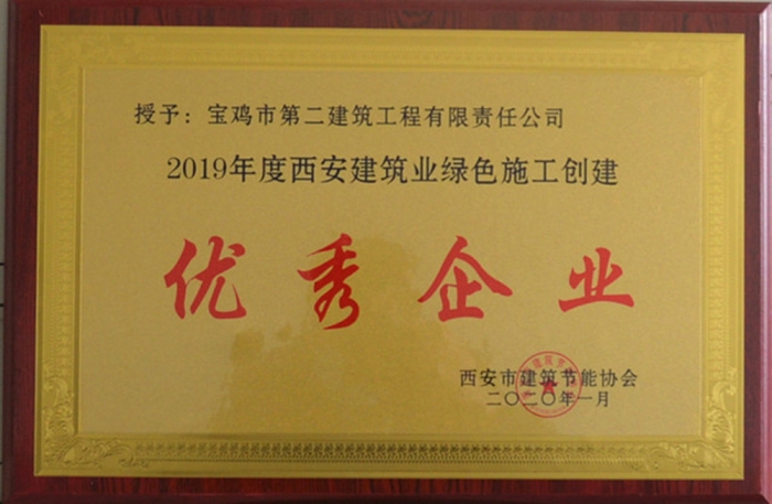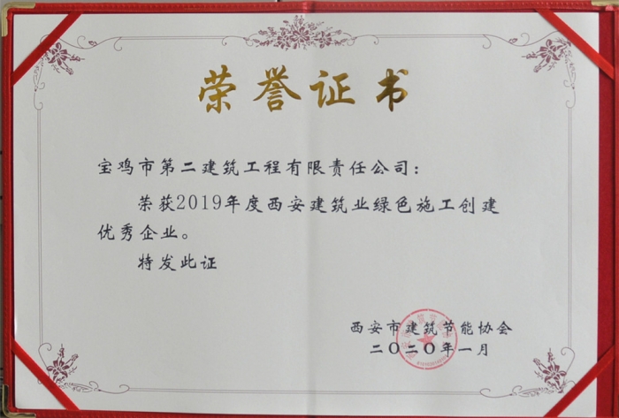近日,從西安市建筑節(jié)能協(xié)會(huì)傳來喜訊,公司榮獲“2019年度西安建筑業(yè)綠色施工創(chuàng)建優(yōu)秀企業(yè)”稱號(hào),公司董事長(zhǎng)胥立榮獲“2019年度西安市建筑節(jié)能行業(yè)優(yōu)秀企業(yè)家”稱號(hào)。